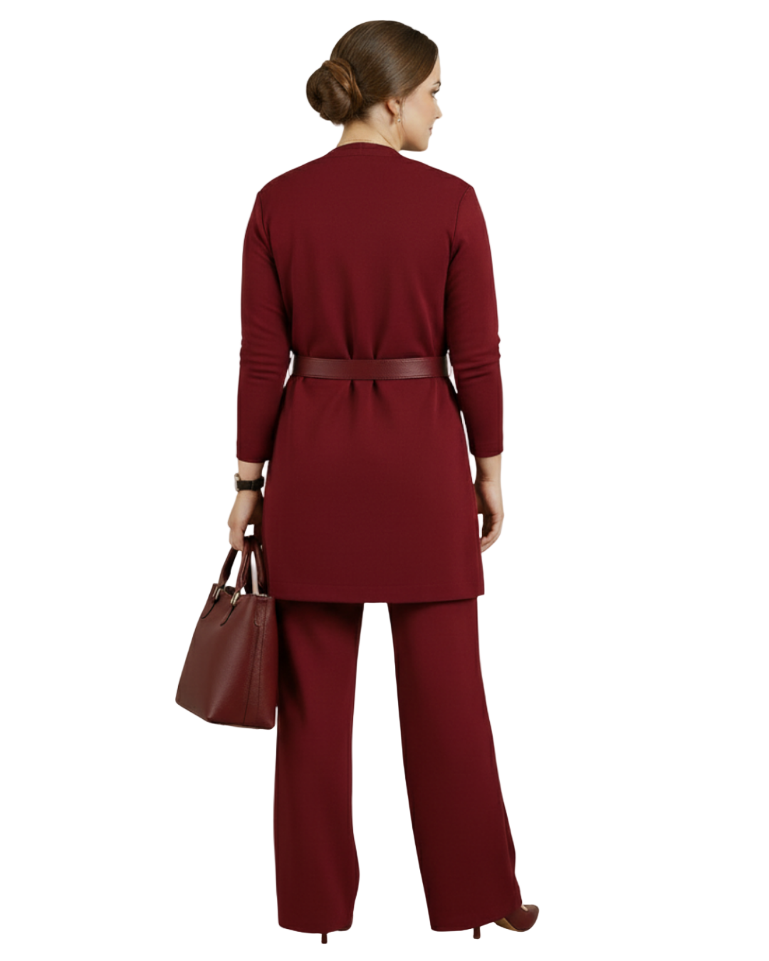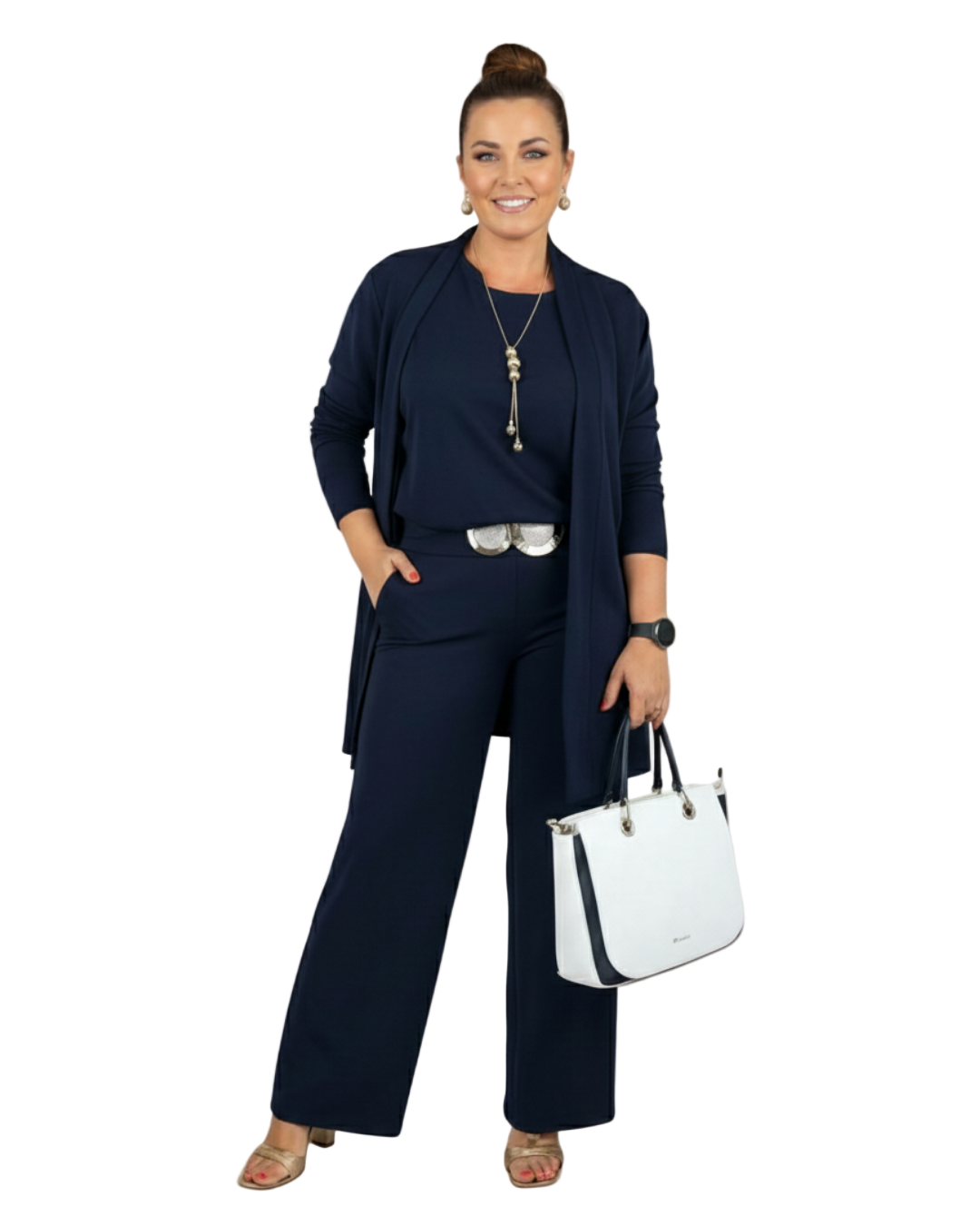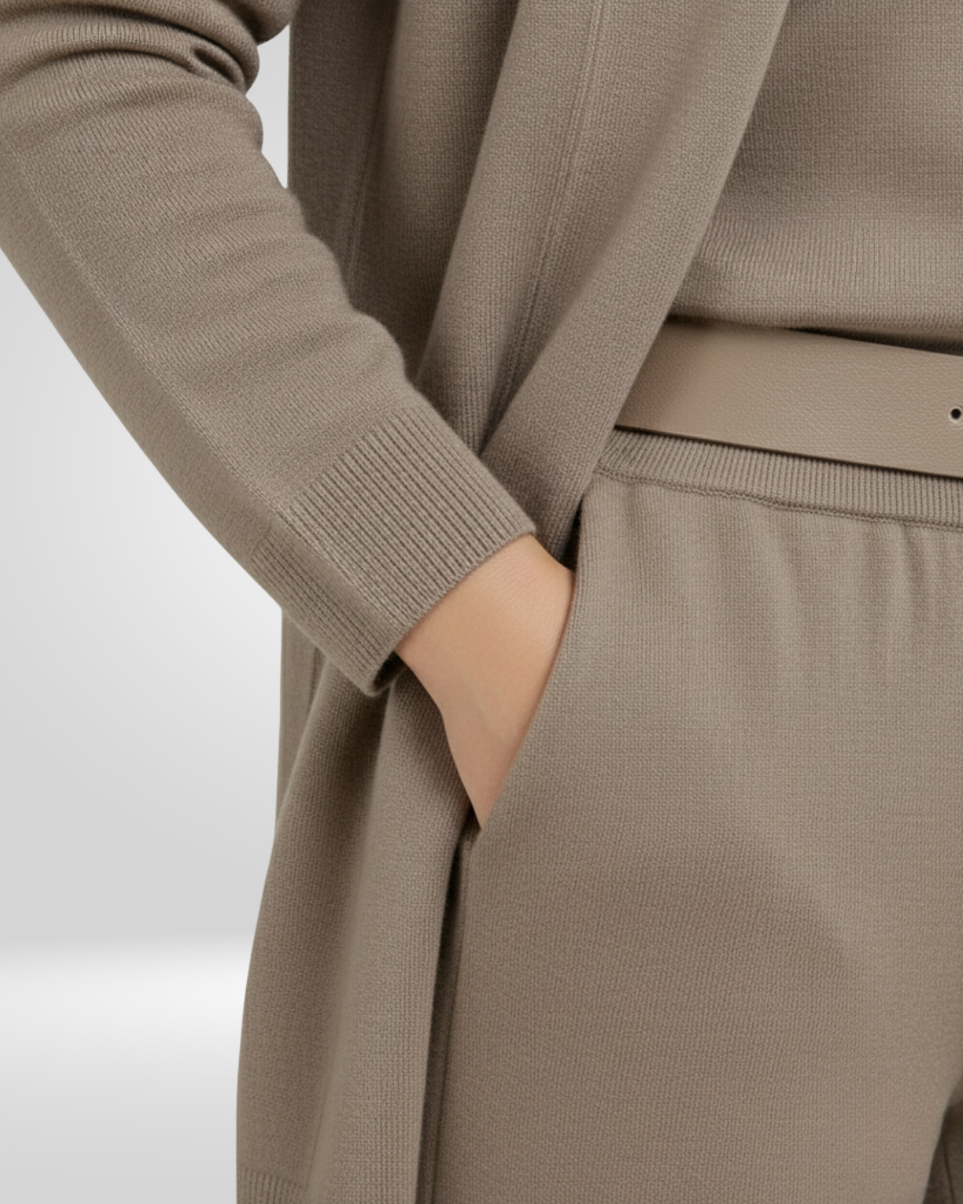De AMÉLIE 3-delige set combineert comfort en verfijning in alle eenvoud. Het lange vest, de top en de broek vormen samen een elegante outfit die zowel casual als chic gedragen kan worden.